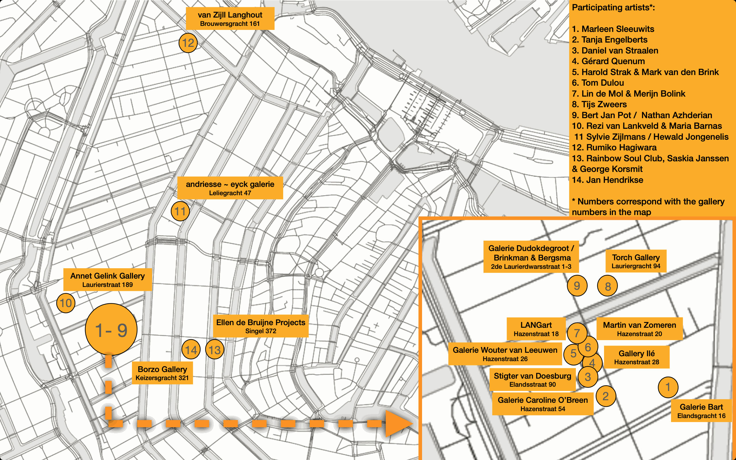 From 16 - 23 December the works will be lit after gallery opening hours, from 18:00 onwards. From 23 December, 2023 - 6 January, 2024 all art works can be seen 24/7. The participating galleries can be found on the map below.